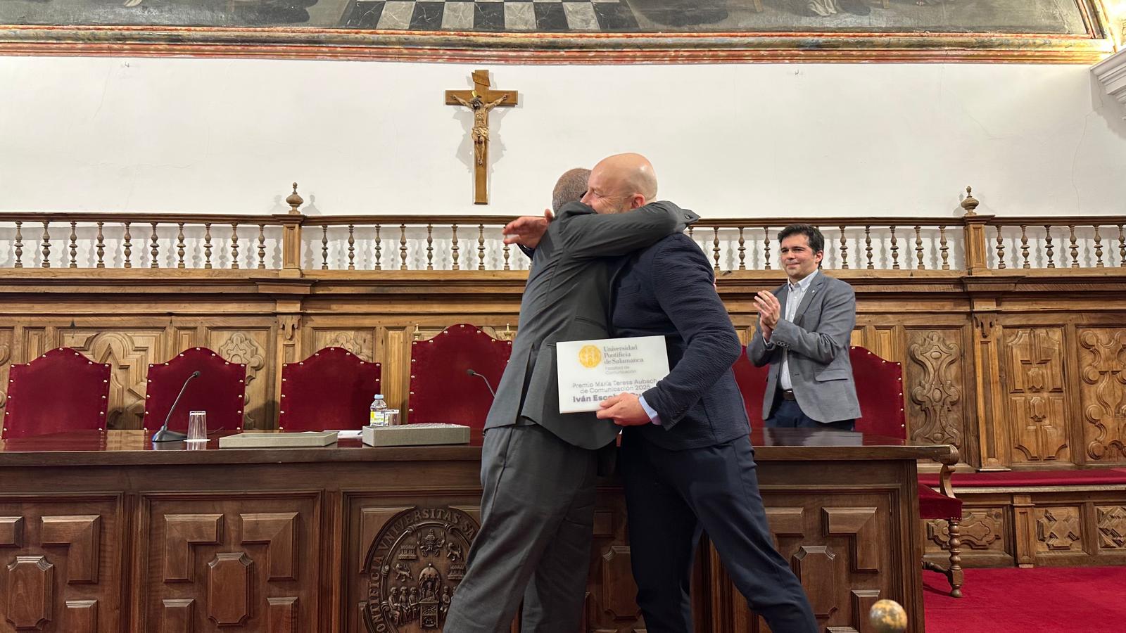 La Facultad de Comunicación de la Universidad Pontificia de Salamanca (UPSA) ha distinguido esta tarde, con el Premio ‘María Teresa Aubach’ de Comunicación 2025, la labor profesional de Iván Escobar Cuesta, antiguo alumno de Comunicación Audiovisual, doctor en Comunicación por la Universidad, profesor durante varios años y uno de los fundadores del Máster de Formación Permanente en Guion de Ficción para Cine y Televisión, de la institución académica.
