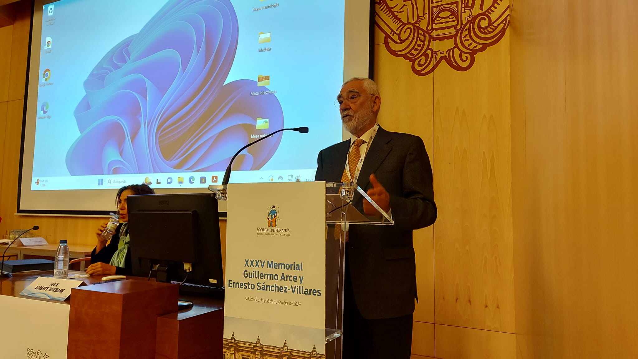 El profesor de la Facultad de Ciencias de la Salud Francisco Javier Pellegrini Belinchón ha recibido esta tarde la medalla del Memorial Guillermo Arce y Ernesto Sánchez-Villares, cuyas jornadas reúnen hoy y mañana a trescientos profesionales de Asturias, Cantabria y Castilla y León. El encuentro ha sido inaugurado por la vicerrectora de Comunidad Universitaria y Estudiantes de la UPSA, María H. Benavente Cuesta, acompañada por la presidenta de la Sociedad de Pediatría de Asturias, Cantabria y Castilla y León, Mª Jesús Cabero Pérez; el presidente de la Fundación Guillermo Arce y Ernesto Sánchez-Villares, Corsino Rey Galán; el presidente de la Asociación Española de Pediatría, Luis Blesa Baviera; y la presidenta del Comité organizador, Beatriz Plata Izquierdo.