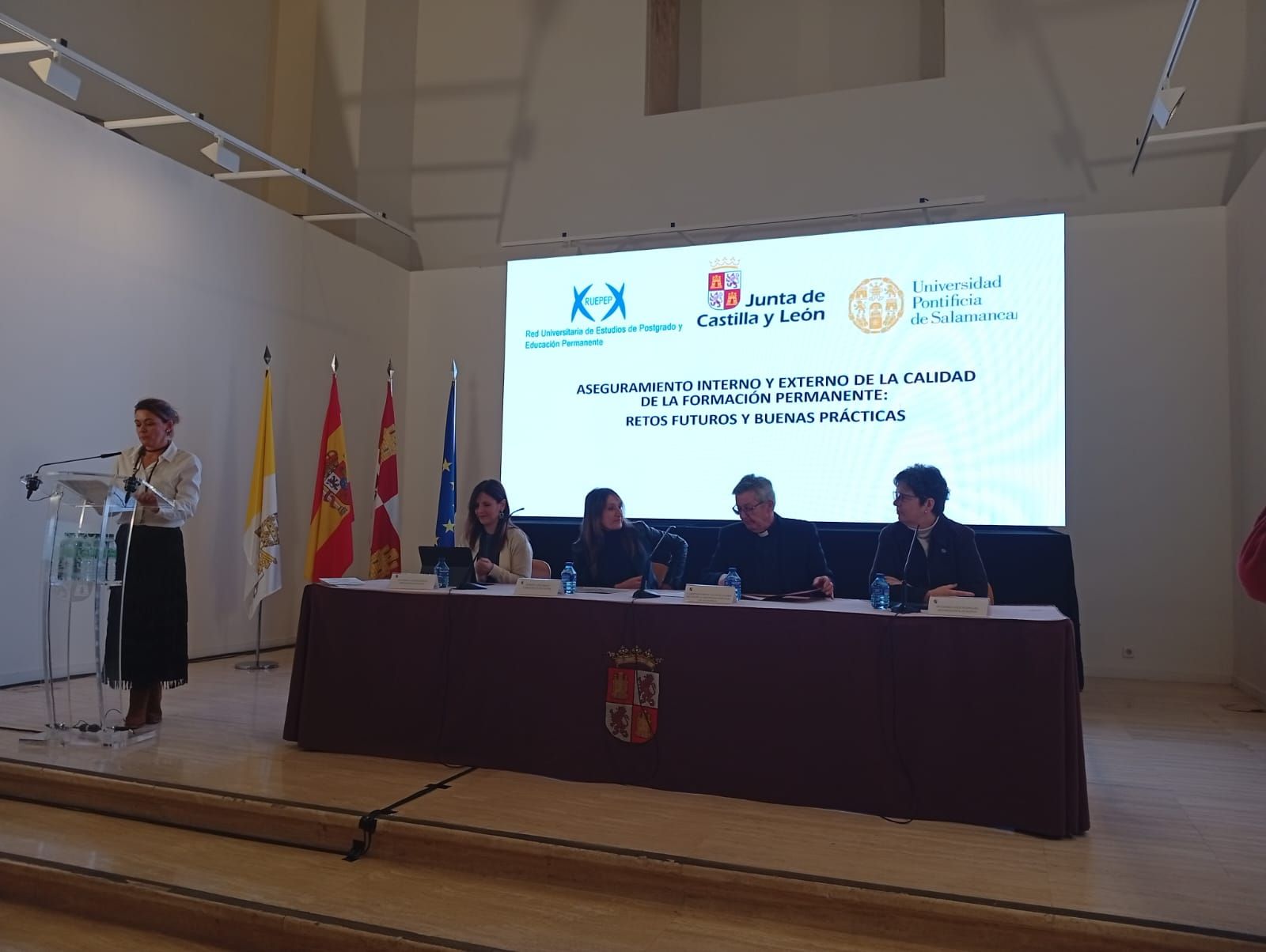 Tras la inauguración, se ha celebrado la mesa redonda ‘Garantizar la calidad de la formación permanente: Máster y Diplomas. Principales retos y oportunidades’, en la que han participado el vicerrector de Formación Permanente y Doctorado de la UPSA, Pedro Sangro Colón; la directora de la Escuela de Formación Permanente de la Universidad Autónoma de Barcelona, Francisca Blázquez Cano; el jefe de la Oficina de Calidad Docente de la Universidad Autónoma de Barcelona, Juan Antonio Alcaide, y el técnico en Programas de Calidad de la Agencia para la Calidad del Sistema Universitario de Castilla y León (ACSUCYL), Raúl Casado del Pozo. Dicha mesa ha estado moderada por Sandra Marcos Ortega, vocal de la Junta Directiva de RUEPEP y adjunta al Rector para la Calidad de la UPSA.