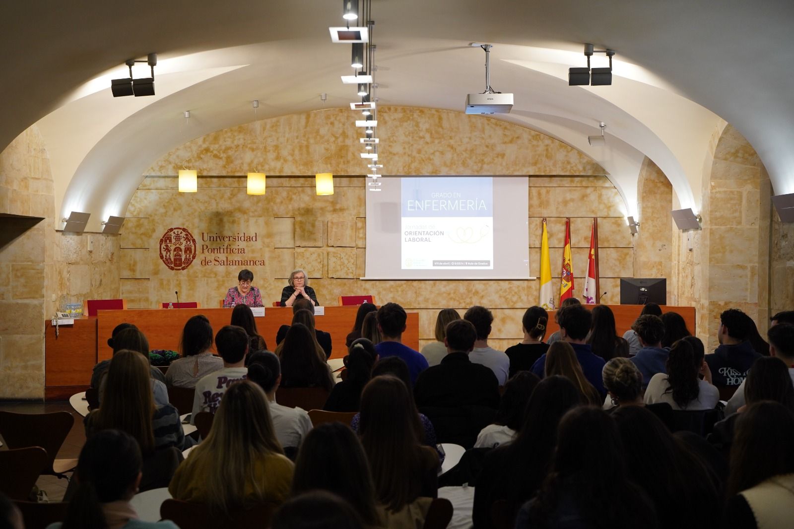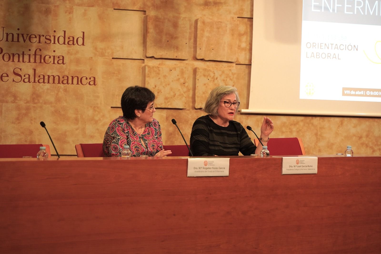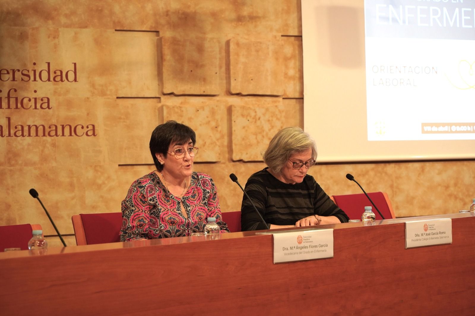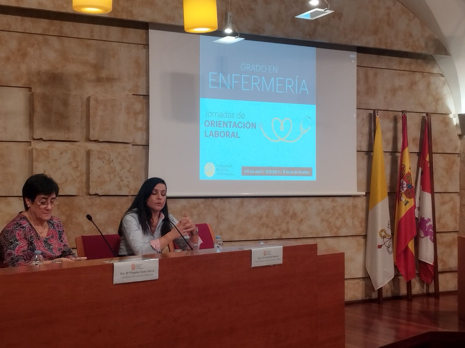 El Grado en Enfermería ha celebrado una jornada de orientación laboral con el objetivo de que los estudiantes descubran nuevos horizontes laborales y especialidades, en la que diferentes profesionales han compartido experiencias y consejos útiles para orientar su futuro. La jornada ha sido inaugurada por la presidenta del Colegio Oficial de Enfermería de Salamanca, María José García Romo, y por la vicedecana de Enfermería, María Ángeles Flores.