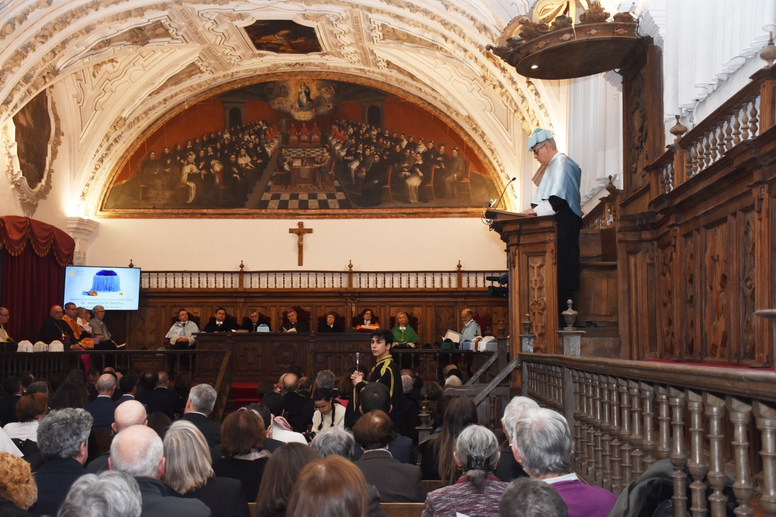 Santiago García-Jalón recordó que desde hace años “la Universidad ha gozado de la liberal colaboración del profesor Conill, quien ha enaltecido así las empresas intelectuales de la Facultad de Filosofía. Es justo y es ocasión de gozo que esta prolongada y fructífera colaboración se culmine con la colación del grado de doctor honoris causa, que quiere reconocer la cordial inteligencia de un maestro y de un aliado incondicional”. En este sentido, el Rector indicó que “por azares del destino, o por divina providencia, me cupo a mí la suerte de ser quien, como Decano de la Facultad de Ciencias Humanas y Sociales, empezara el proceso que ha desembocado en este feliz día y que yo sea igualmente quien haga de portavoz de la Universidad en este solemne acto académico, que concluye el largo trámite por el que la Pontificia de Salamanca otorga su máxima distinción a D. Jesús Conill. Comprenderán que esta fecha sea para mí de especial regocijo y que mi felicitación al nuevo doctor tenga particulares resonancias”.