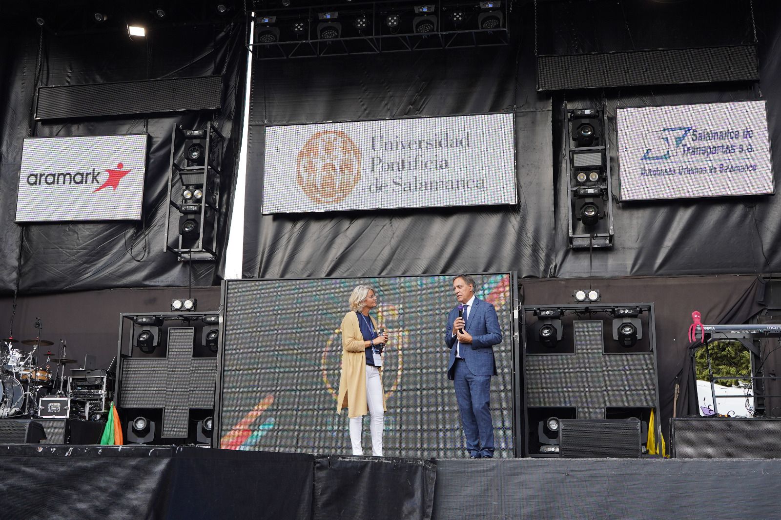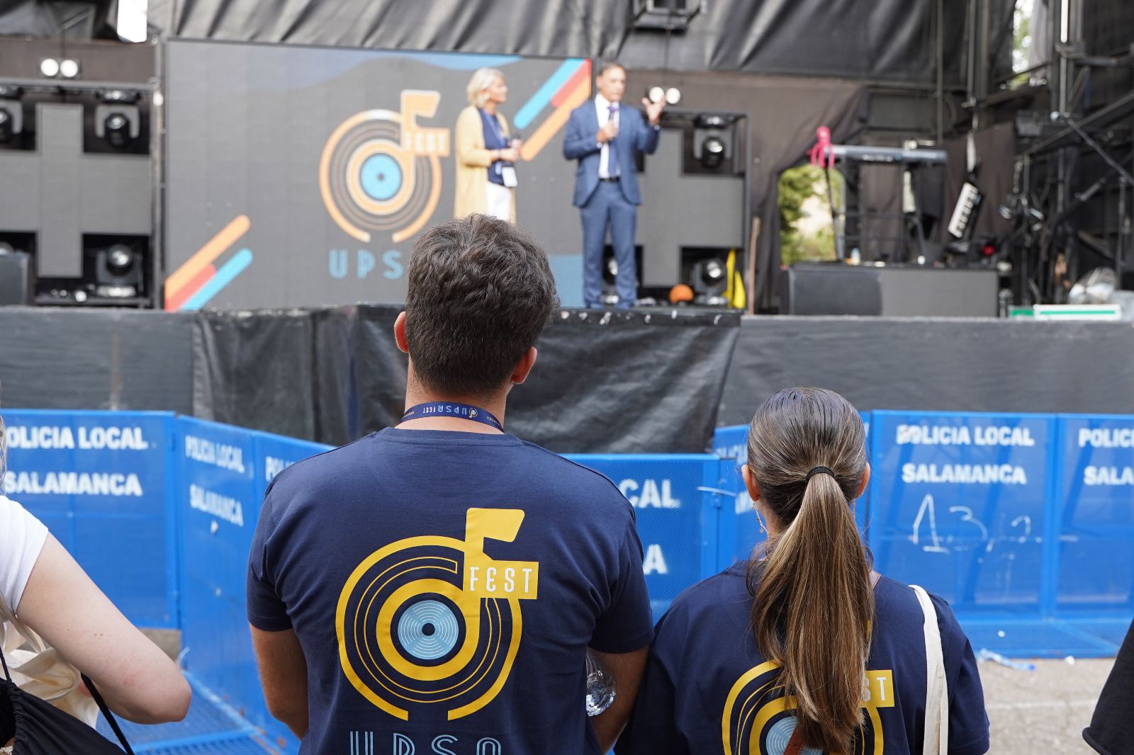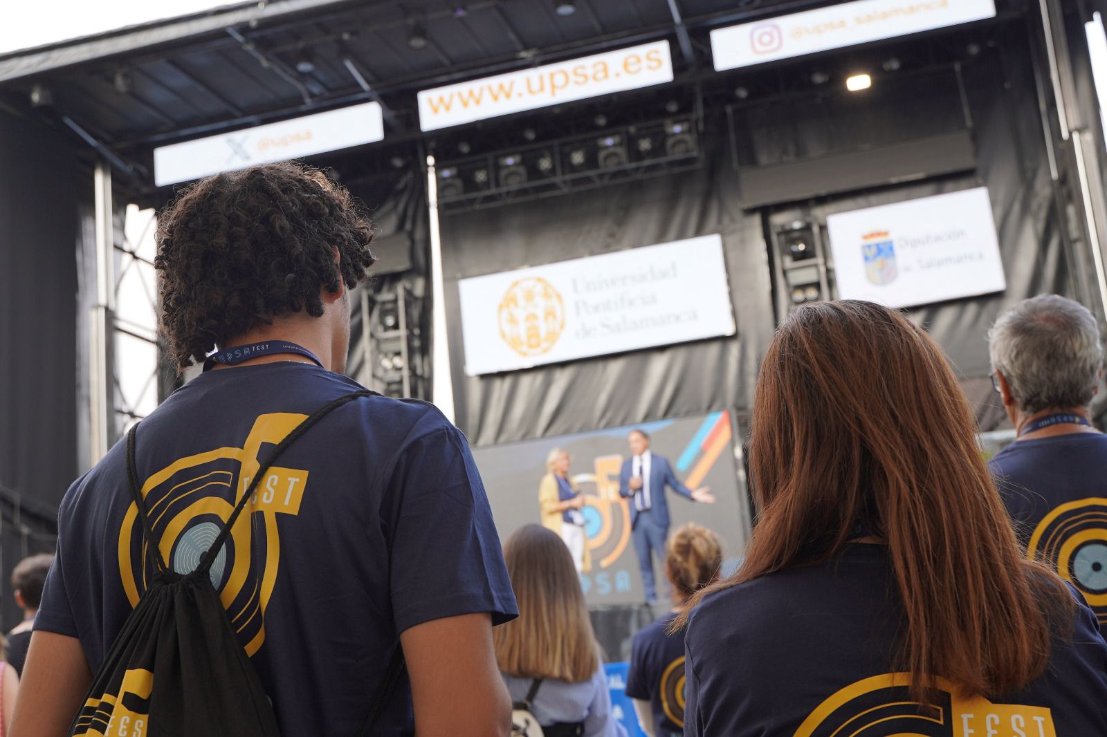 María H. Benavente, deseó un feliz curso a todos y animó a que “hagamos realidad el lema del UPSAFest: Vive tu Universidad”. Asimismo, agradeció de manera especial a los estudiantes “por responder a nuestra invitación y, por supuesto, por la confianza que nos habéis demostrado al elegirnos”. Además, ha destacado que “llevamos meses trabajando con mucha ilusión en la organización de este momento para daros la bienvenida, tanto a nuestra Universidad como a Salamanca, y para invitaros a que durante vuestros años con nosotros tengáis una experiencia universitaria única. También queremos en este evento, donde está representada toda la comunidad universitaria, que encontréis un rato de encuentro en un ambiente familiar, haciendo muy presente que somos muchos los que hacemos el camino juntos”.