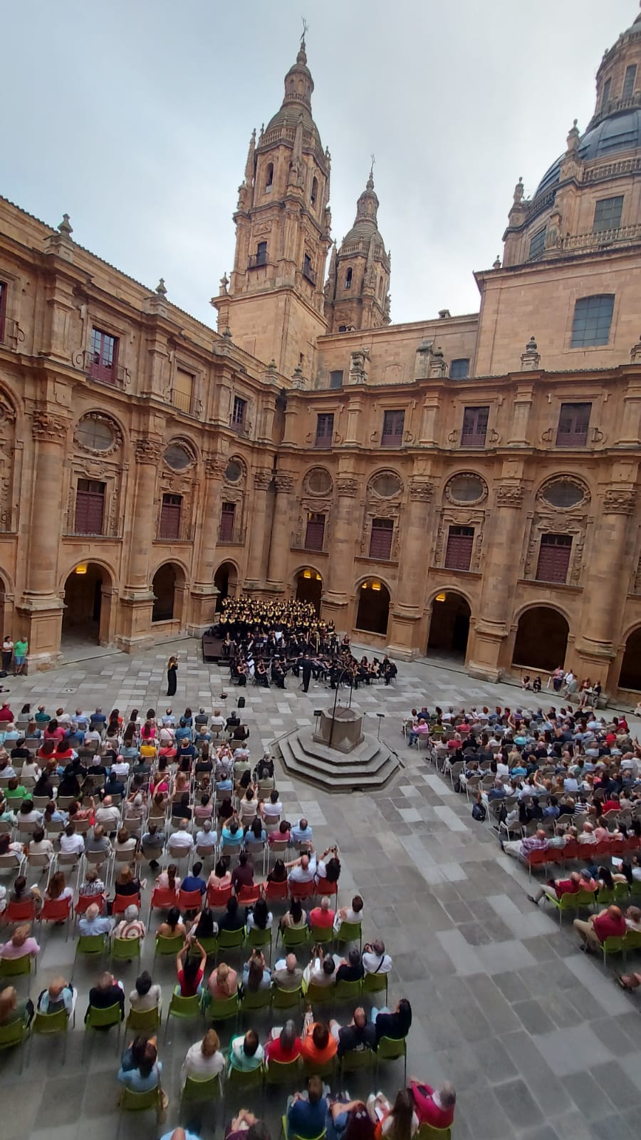 El Patio Barroco de la Universidad acogió este sábado el tradicional Concierto de Fin de Curso, ofrecido en esta ocasión por la Banda de Música Tomás Bretón y el Coro Tomás Luis de Victoria y dedicado a la ‘Música de Cine’. Como en años anteriores, la cita sumó un nuevo éxito de público, con medio millar de asistentes, entre quienes estaba el Rector, Santiago García-Jalón de la Lama, y los vicerrectores Pedro Sangro y María H. Benavente.