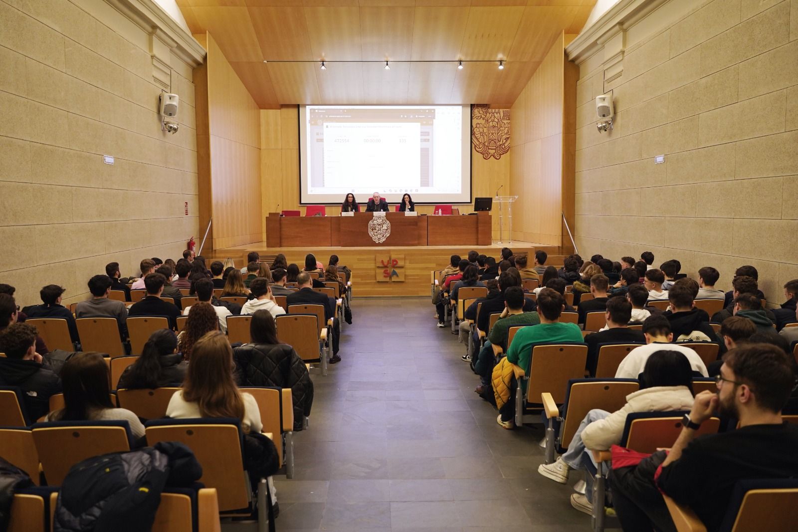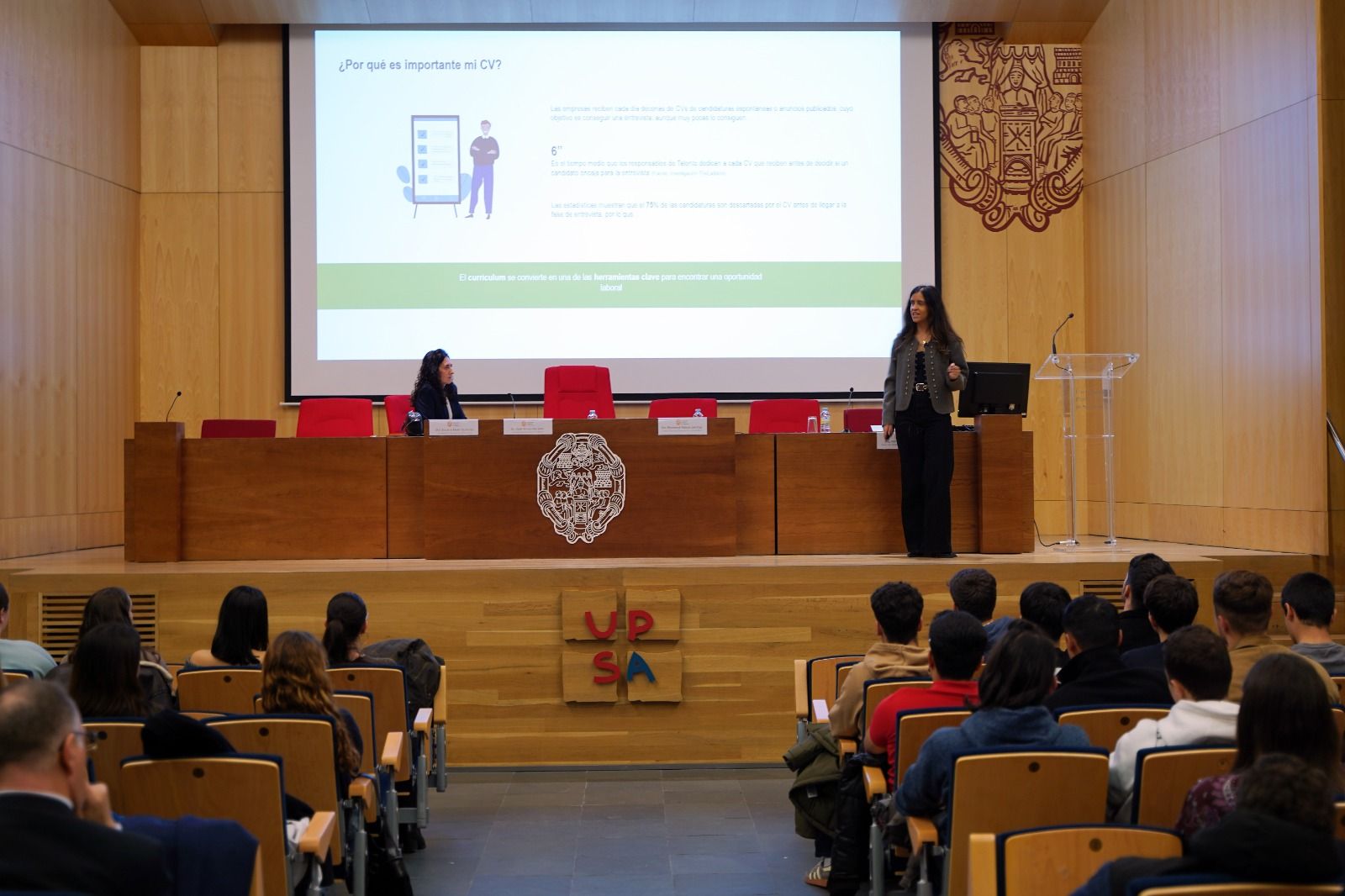 Posteriormente, la vicedecana de la Facultad, Encarna Beato Gutiérrez, ha expuesto en una ponencia cuáles son las oportunidades que ofrece la UPSA a los estudiantes más allá del grado, destacando la oferta de posgrados de la Universidad y las peculiaridades de cada uno de esos títulos en función de los intereses de los recién graduados.