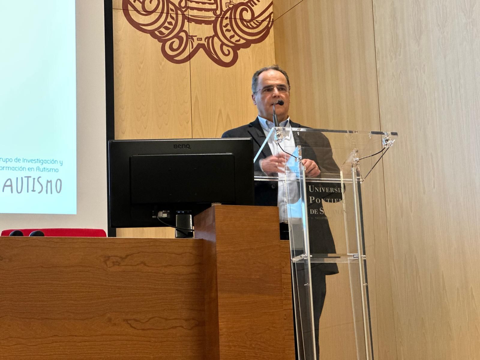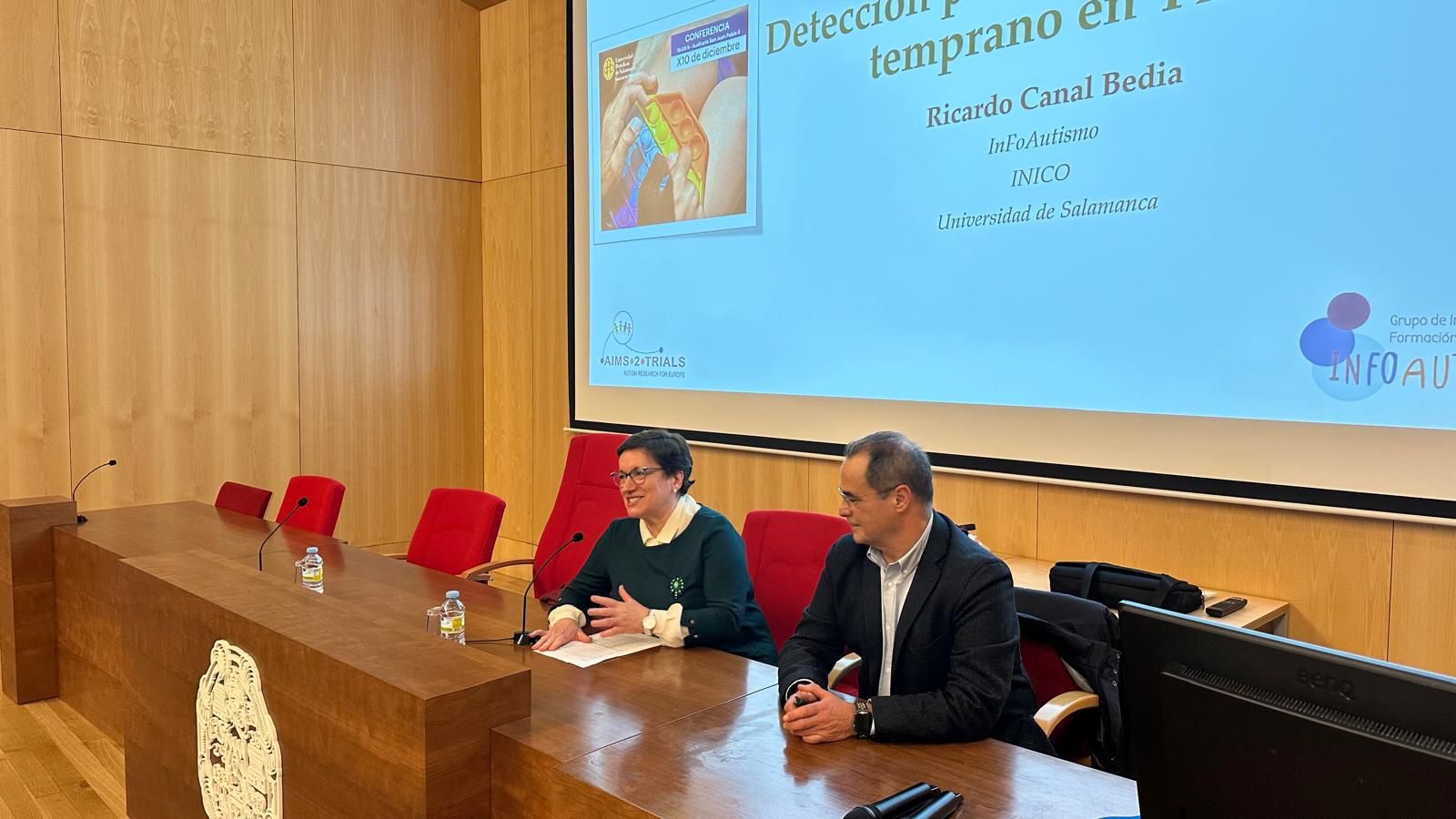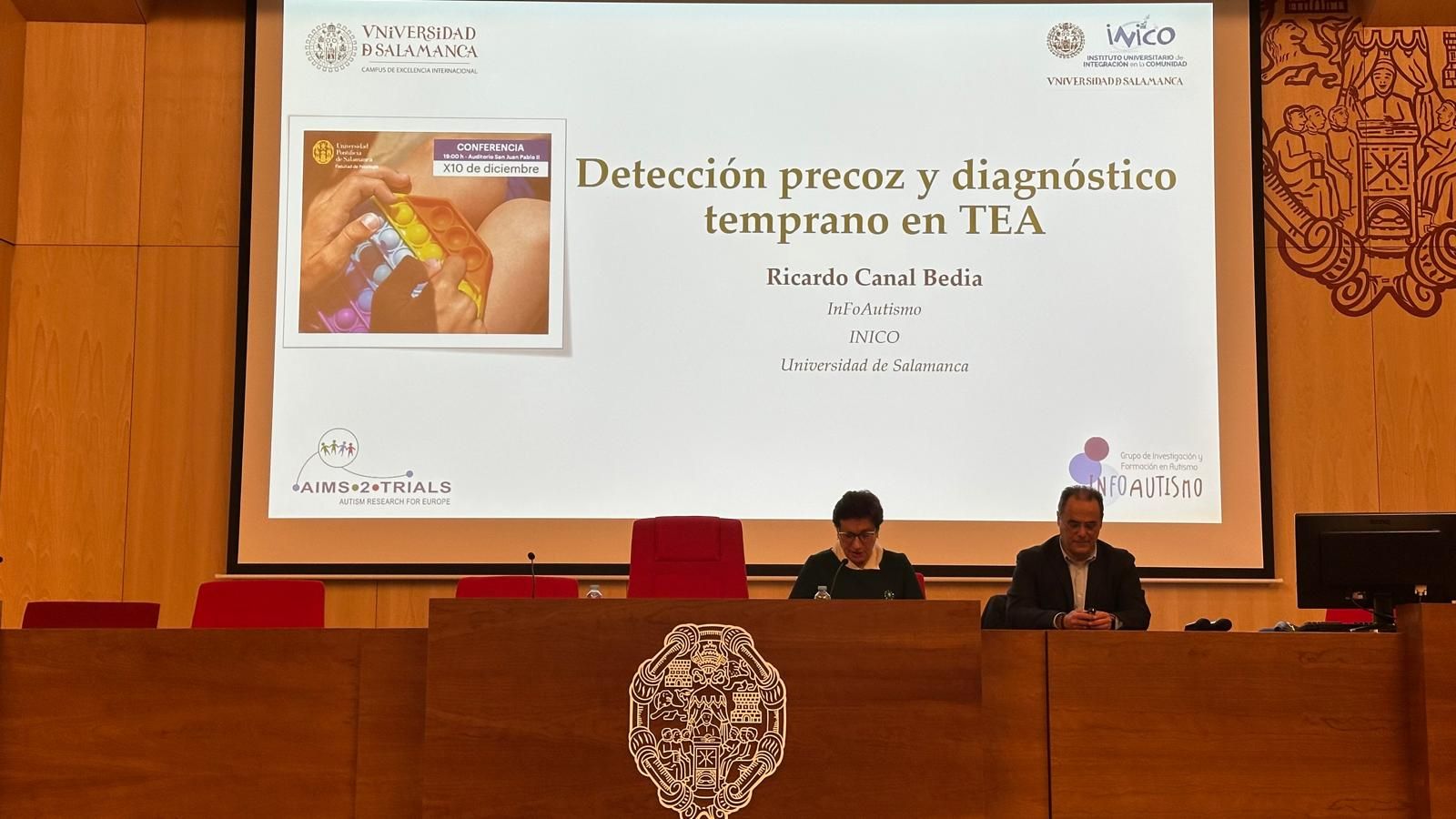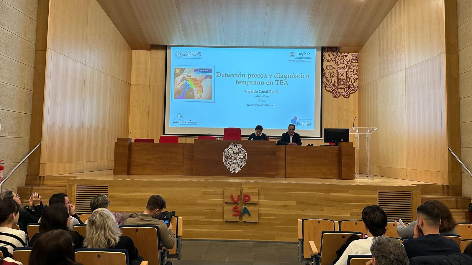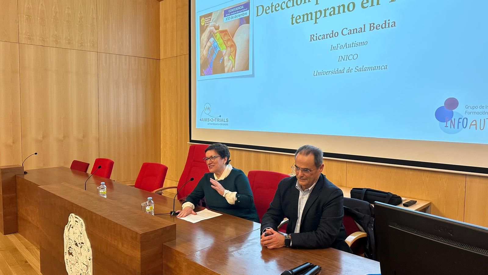 En este sentido, el decano de la Facultad de Educación de la USAL ha ampliado su intervención indicando que “los genes solo no lo explican todo y que esa alteración tiene que ver con la experiencia y dependencia con el entorno. Cuanto antes se detecte el riesgo de TEA, más probable será que la intervención cambie la trayectoria atípica”. Ricardo Canal también ha especificado en su exposición cuáles pueden ser las alteraciones genéticas y los mecanismos neurobiológicos implicados, así como las consecuencias positivas que tendría una detección y diagnóstico temprano. Posteriormente, ha expuesto varios ejemplos de las dificultades que muestran los niños con autismo -vinculados a la mirada referencial, la atención conjunta, la referencia social, la imitación o el comportamiento ante los actos de juego compartido- y ha incidido en que “el autismo emerge gradualmente, lo cual demuestra que es importante hacer un esfuerzo para la detección precoz. Una intervención temprana tendría un impacto muy positivo y va a impulsar el desarrollo. Las intervenciones tempranas conducen a mejoras significativas. Un diagnóstico precoz se asocia a niveles más bajos de estrés y ansiedad, además de ahorro en costes sanitarios. En concreto, en los ’90 se desarrollaron herramientas de detección precoz tipo M-CHAT-R, cuestionario que se aplica como cribado de TEA específico en Castilla y León”.