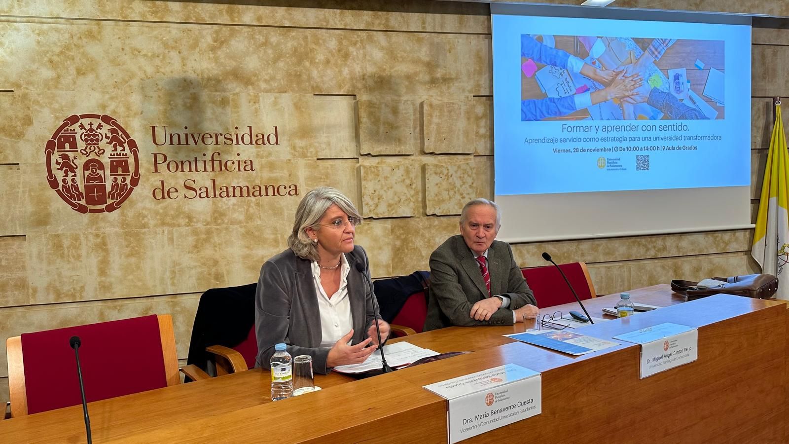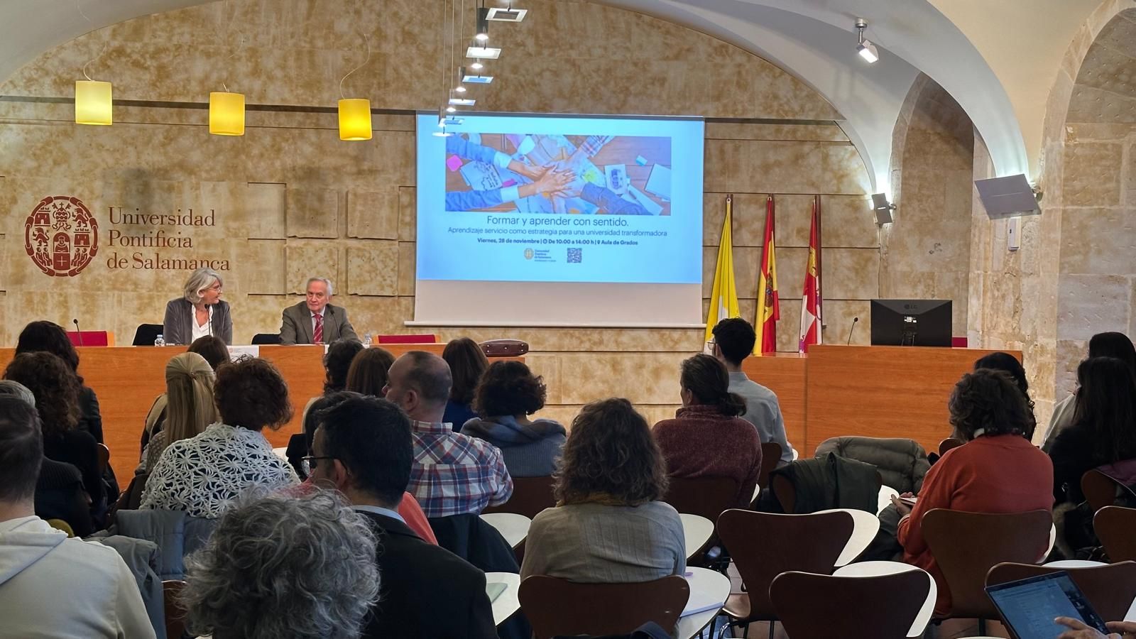 El Servicio de Voluntariado y Cultura de la Universidad Pontificia de Salamanca (UPSA) ha organizado hoy la Jornada Formar y aprender con sentido. Aprendizaje-Servicio (ApS) como estrategia para una Universidad Transformadora. Las sesiones, celebradas en el Aula de Grados, han comenzado con las palabras de la vicerrectora de Comunidad Universitaria y Estudiantes, María H. Benavente Cuesta, quien ha señalado que “aunque hay muchos proyectos ApS, este en concreto refleja el comienzo de una metodología que apuesta por la excelencia académica y la función social. Quiero aprovechar también para dar las gracias a las entidades colaboradoras por permitirnos hacer universidad fuera”. Además, ha concretado que “nuestra misión en la Universidad es social y tiene que ir enraizada con nuestra excelencia académica para ayudar a los demás a mejorar su vida”.