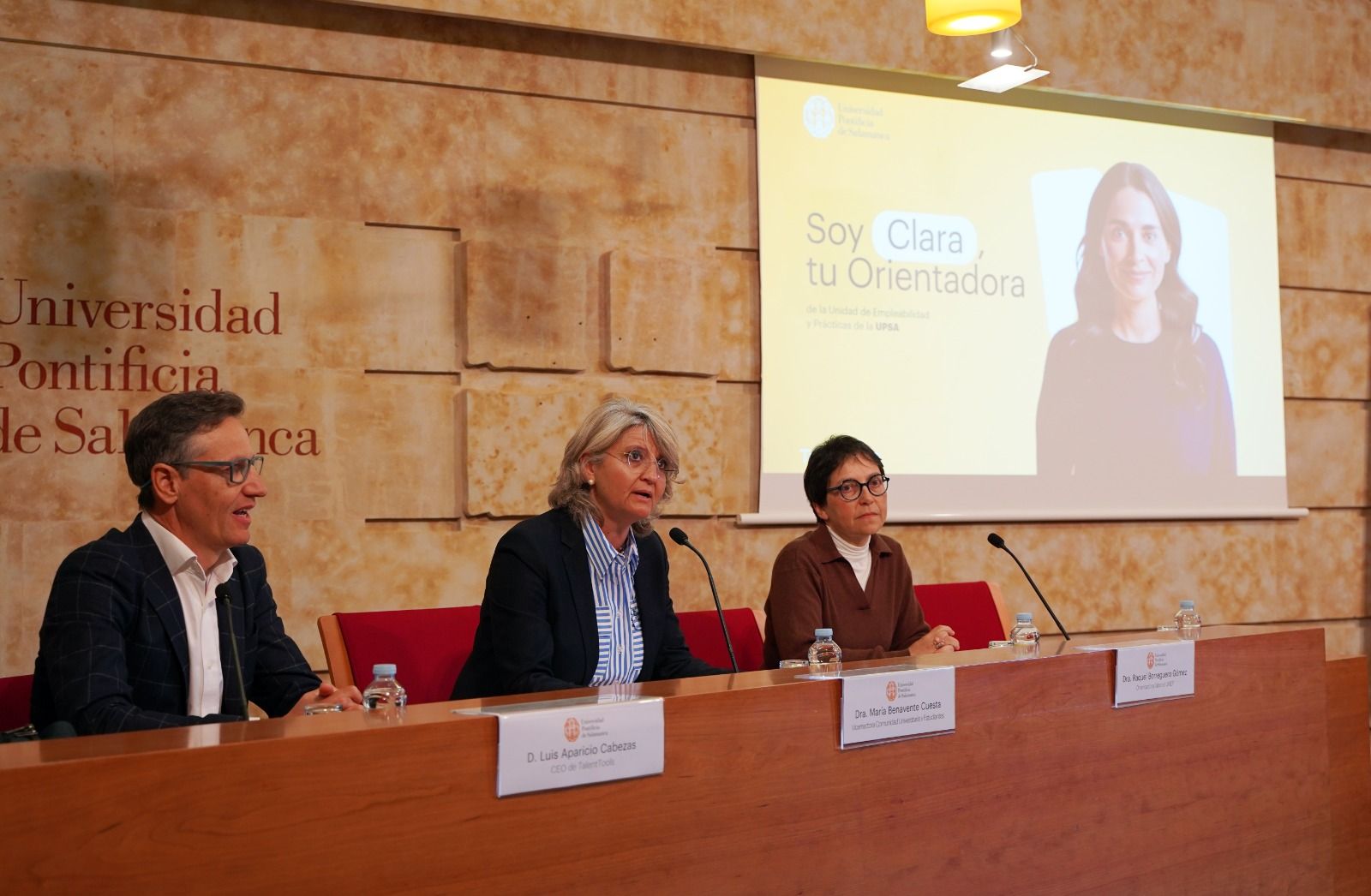 El acto de presentación, celebrado esta mañana en el Aula de Grados de la Sede central de la UPSA, ha contado con la participación de la vicerrectora de Comunidad Universitaria y Estudiantes, María Hinojal Benavente Cuesta; el CEO de TalentTools, empresa responsable del desarrollo tecnológico de Clara, Luis Aparicio Cabezas, y la orientadora laboral de la Unidad de Empleabilidad y Prácticas (UNEP) de la Universidad, Raquel Borreguero Gómez.